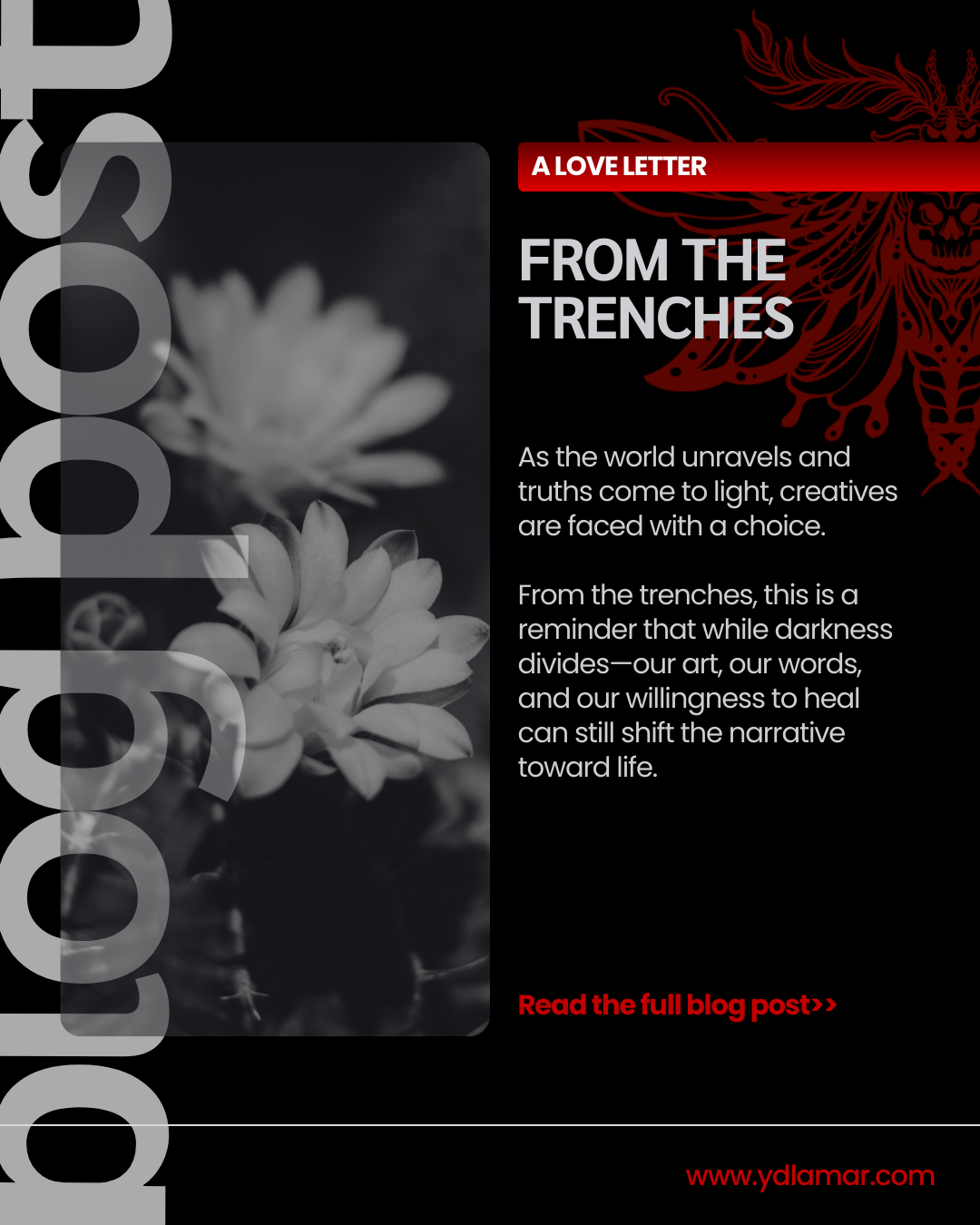 I love the unconventional, the ones who are forgotten, the underdogs and the ones that seemed never destined for anything but were chosen. My characters are amazingly flawed, reflect the ugliness of what's out there as well as the possibility of finding the sliver of light in a world eclipse by the dark. And many of my stories, though some are grim and lost in their own mental strongholds, show us that even amongst what feels like the void, there's still hope left if chosen.